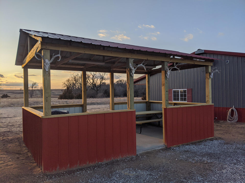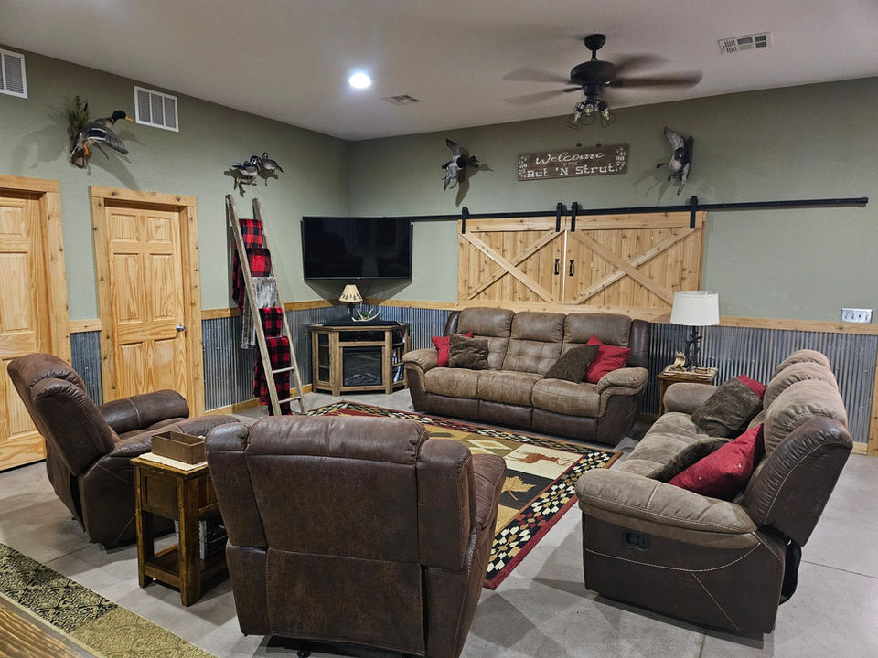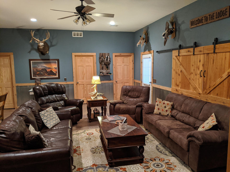 Here at The Rut 'N Strut Lodge we take pride in making sure you have a comfortable and memorable stay. Our lodges are fully furnished with everything you need aside from food and drink. Each lodge has a fully furnished kitchen, 2 bathrooms, 4 bedrooms (10 beds in south lodge, 8 beds in north lodge) open living/dining area and mud/laundry room. In between the lodges sits a covered outdoor cooking area with 2 propane grills, 2 charcoal grills, electric smoker and 2 picnic tables. For the hunters there is a game cleaning shed adjacent the lodges with a large stainless steel sink, stainless steel table, deep freezer and trolley system to hang/clean/store game animals. Also available are 8 outdoor covered dog kennels. Please see our full list of amenities offered below: